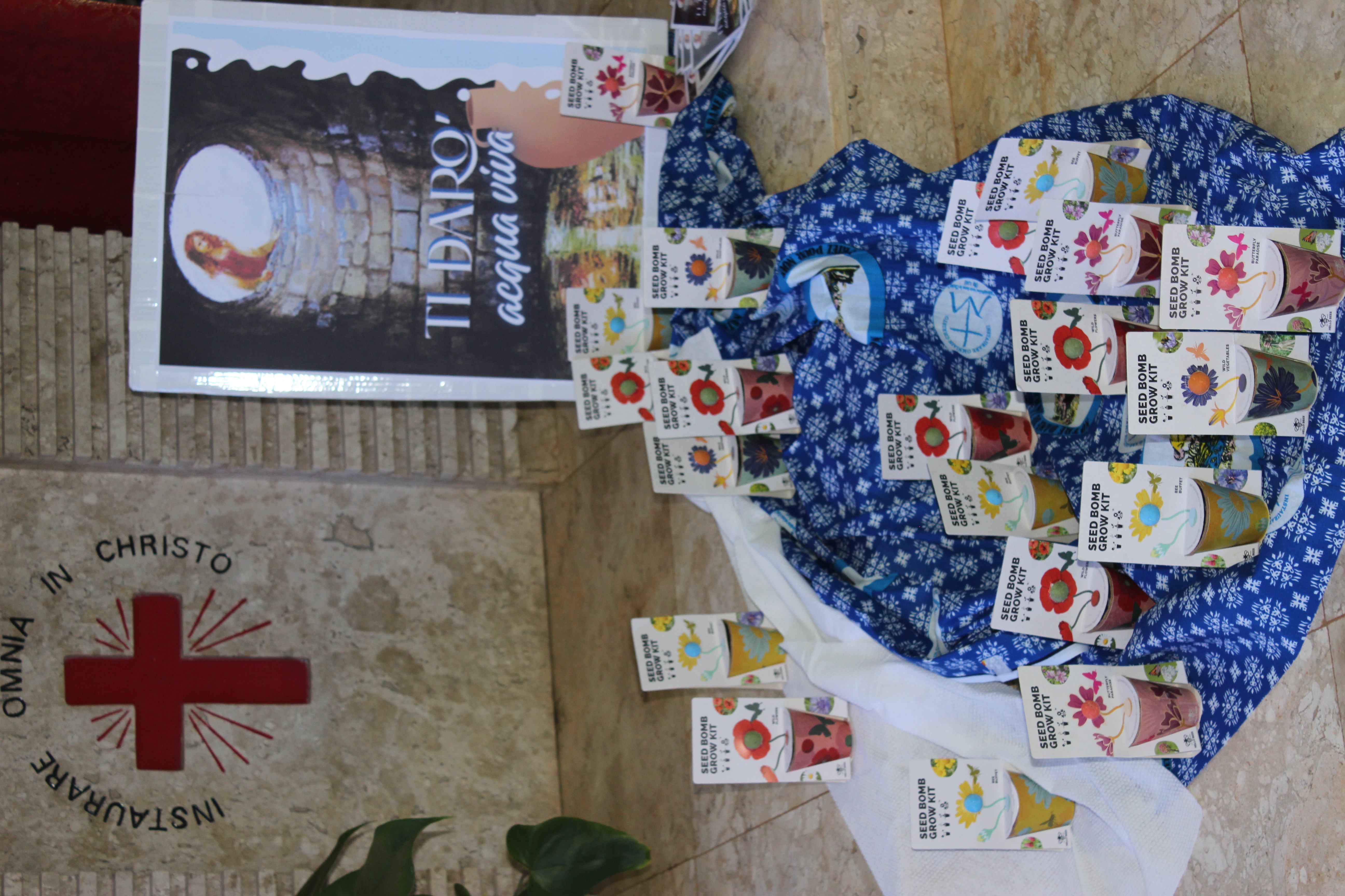 - Una stoffa africana blu, simbolo dell’acqua viva che il Signore non smette di donarci e alla quale ci chiama a essere sorgente per gli altri, in ogni terra e circostanza.